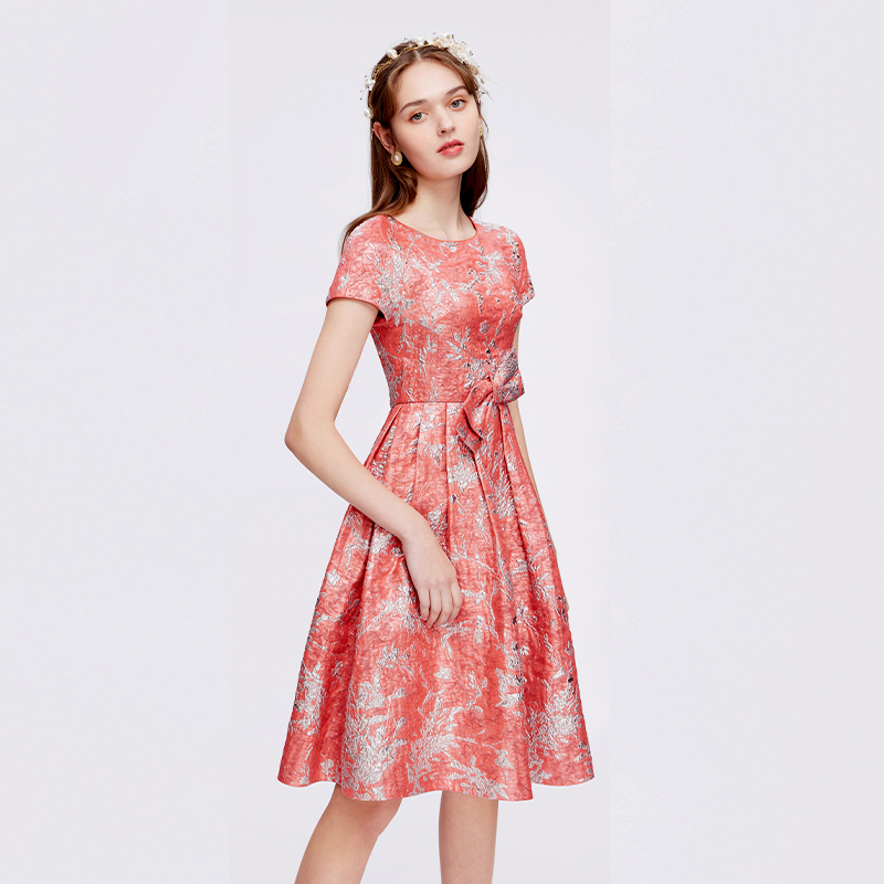 VOTRE【高定奢品】原创Ruffo coli意大利真丝提花粉橙气质连衣裙